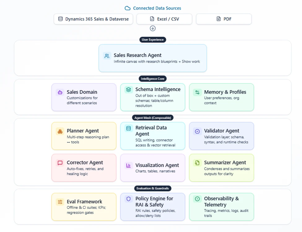 The Sales Research Agent has a native multi-agent orchestration layer that connects directly to Dynamics 365 Sales data. This allows it to autonomously discover schema relationships and entity dependencies, and to perform natural-language-to-query reasoning natively within its own orchestration stack.