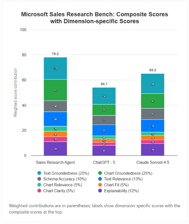 This post introduces the architecture and evaluation methodology and results behind Microsoft’s Sales Research Agent. Its technical innovations distinguish the Sales Research Agent from other available offerings, from multi-agent orchestration and multi-model support to advanced techniques for schema intelligence, self-correction and validation. In determining how best to evaluate the Sales Research Agent, Microsoft reviewed existing AI benchmarks and ultimately decided to create the Sales Research Bench, a new benchmark purpose-built to measure the quality of AI-powered Sales Research on business data, in alignment with the business questions, needs, and priorities of sales leaders. In head-to-head evaluations completed on October 19, 2025, the Sales Research Agent outperformed Claude Sonnet 4.5 by 13 points and ChatGPT-5 by 24.1 points on a 100-point scale.