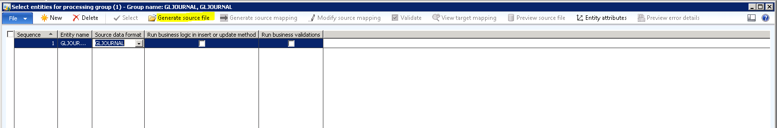 7. On the “Select entities for processing group” form, enter “GLJOURNAL” for both the “Entity name” and the “Source data format”. Click “Generate source file”.