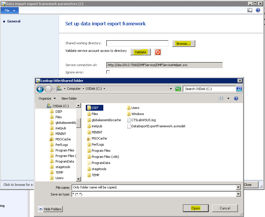 2. Navigate to Data import export framework | Setup | Data import export framework parameters. Click “Browse” next to “Shared working directory” and select the “DIEF” folder we created. Once selected, click “Validate”.