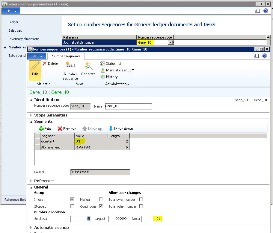 12. Click “Edit”, change the “_010” to “JN”, and click “Move up”. Click the “General” fast tab and note the “Next” value, in my case “JN000421”.