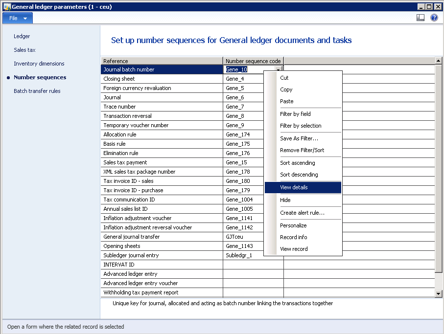 11. Go to General ledger | Setup | General ledger parameters. Click “Number sequences”. Right-click “Gene_10” next to “Journal batch number” and click “View details”.
