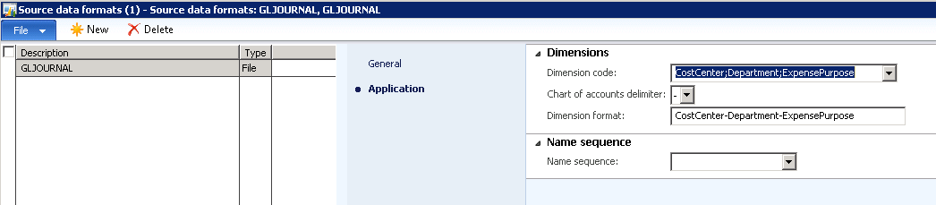 4. Go to Data import export framework | Setup | Source data formats. Enter “GLJOURNAL” for the “Source name” and “Type” = “File. In the parameters on the right side, enter “File format” = “Delimited”, “First row header” = TRUE, “Row delimiter” = “{CR}{LF}”, “Column delimiter” = “Comma {,}”, “Text Qualifier” = “*”, and “Role separator” = “;”. Click “Application”, and then select “CostCenter”, “Department”, and “ExpensePurpose”. Enter “CostCenter-Department-ExpensePurpose” for the “Dimension format” value.