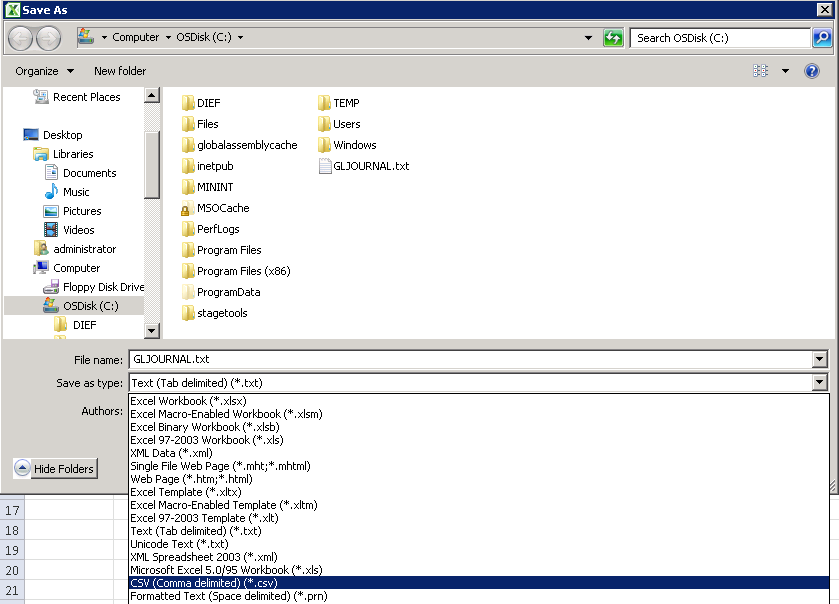 17. Open Excel. Click File | Open. Navigate to the C: drive and select the “GLJOURNAL.txt” file (You may need to change the drop menu to “All Files (*.*)”)