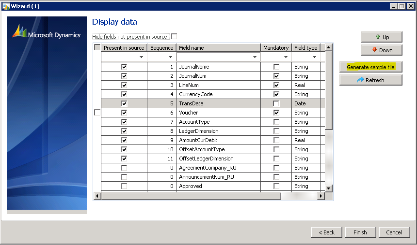 8. On the “Wizard” form, click “Next”. For the “Display data” fields, select the following and put them in the following sequence: JournalName, JournalNum, LineNum, CurrencyCode, TransDate, Voucher, AccountType, LedgerDimension, AmountCurDebit, AmountCurCredit, OffsetAccountType, OffsetLedgerDimension. Click “Generate sample file”.