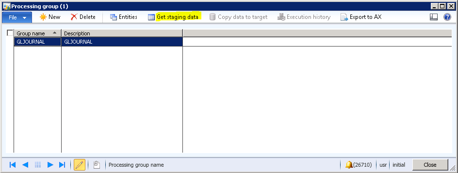 25. On the “Processing group” form, select the line for “GLJOURNAL” and click “Get staging data”.
