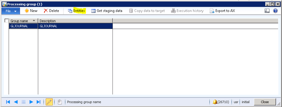 6. Go to Data import export framework | Common | Processing group. Type “GLJOURNAL” for the “Group name”, Ctrl+S to save, and click “Entities”.