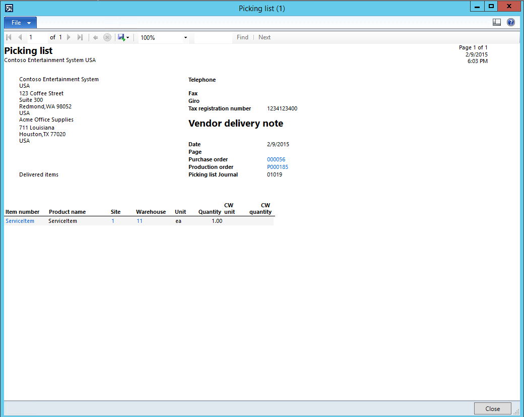 1. The next report should then be the Service item Picking List with Vendor delivery note.