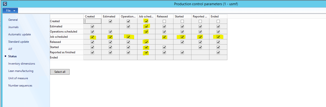 5. In the Status area of Production control parameters, you need to make sure that you have all of the options marked for Job scheduled.