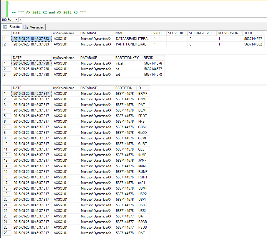 The last set of queries show you how your AX environment is configured with regards to passing in DATAAREAID and PARTITION (R2 and R3 only) as LITERALS, and in order to establish if that might be a good idea, we check to see if you have one or more PARTITION and if you have many AX companies (DATAAREAIDs).