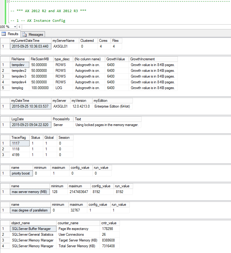 The scripts I provided look at the SQL Server instance and the AX databases deployed there. Let’s start by looking at the SQL Server instance you are using to run your AX databases on. For background information on this area, please see the official Microsoft Dynamics AX documentation, e.g.: