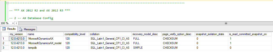 The output from the script shows us how the AX databases and the TempDB have been configured. We can see what compatibility level they are running at, and what their collations are set to. We can see the recovery model, and establish if RCSI has been enabled or not.