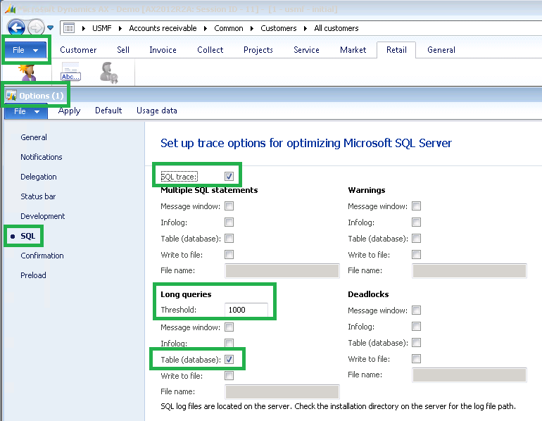 Once this has been enabled, we should hopefully capture some long running queries in a table in the AX 2012 RTM / R2 / R3 database called SYSTRACETABLESQL.