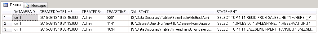 SELECT TOP 50 [DATAAREAID], [CREATEDDATETIME] , [CREATEDBY], [TRACETIME], [CALLSTACK], [STATEMENT]