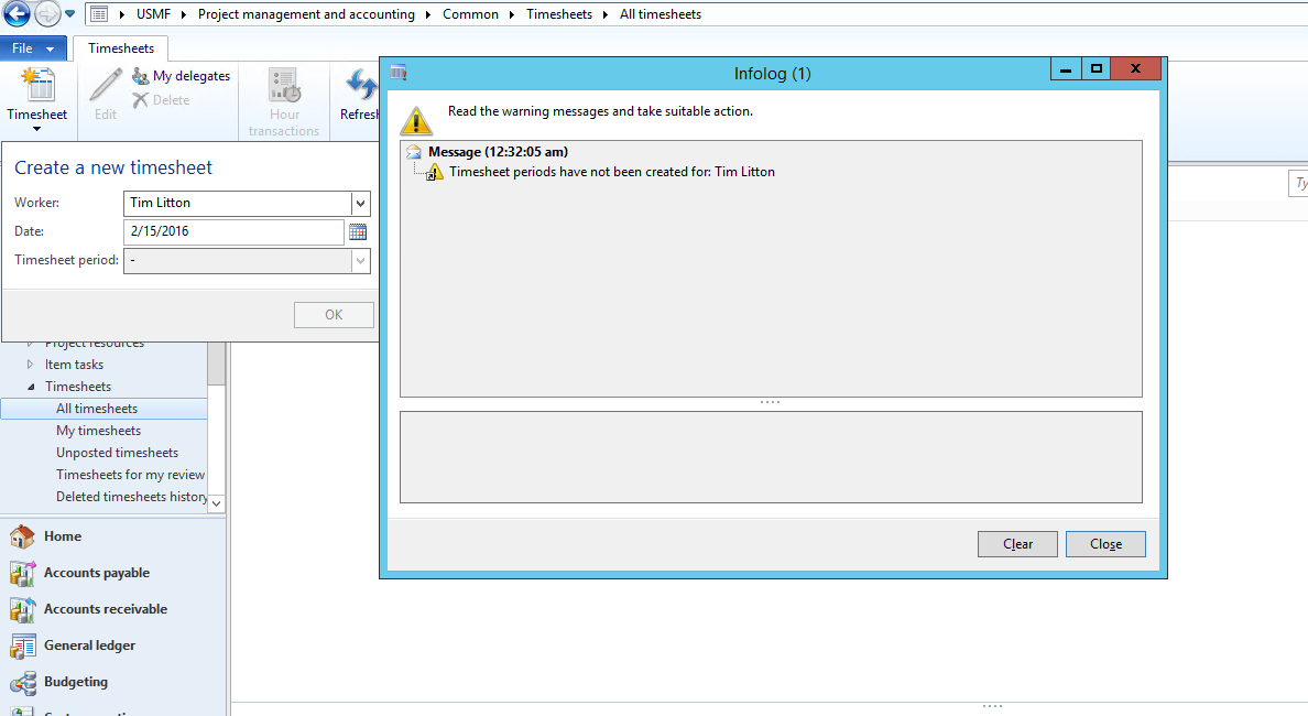 Occasionally when you want to add a new Project Timesheet you might run into the following error message