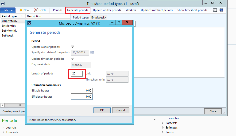 I then go to Project Management and accounting\Setup\Timesheets and select ‘Timesheet period types’. In here standing on the period type ‘EmplWeekly’ I press ‘Generate periods’ . I this case I define I want to create the period for 20 weeks and press OK