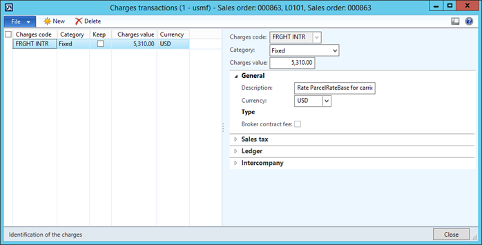 12. In the Sales order form, press Financial -> Maintain charges and check the charges associated to the order. Freight charges are linked to the order line.