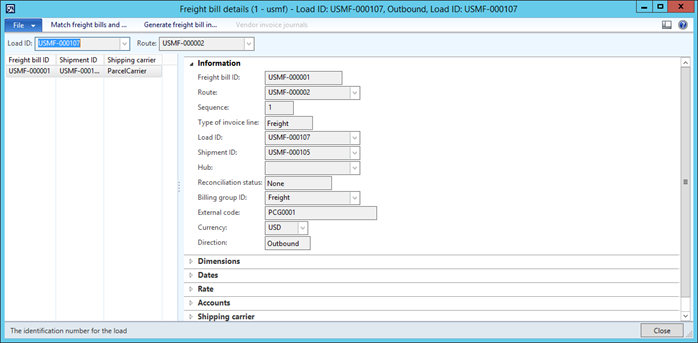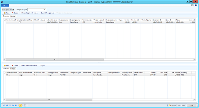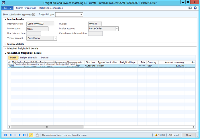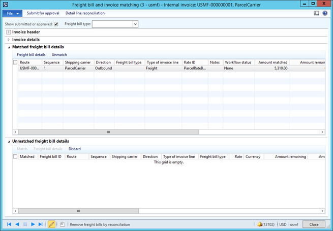 15. In Freight invoice details, press Match freight bill and invoice. In the Unmatched freight bill details section, select the freight bill and click Match.