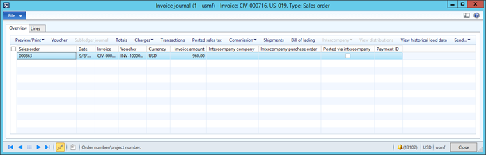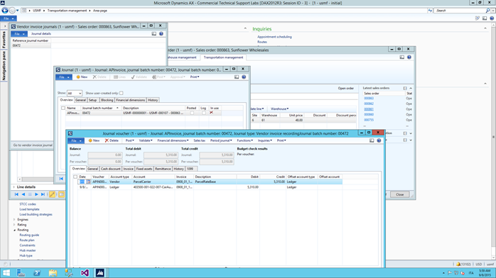 18. Go back to the Sales order form -> Transportation management tab -> Invoice area -> vendor invoice journals -> Journal detail. An invoice journal was generated in Accounts Payable for the freight amount to be paid to the carrier.