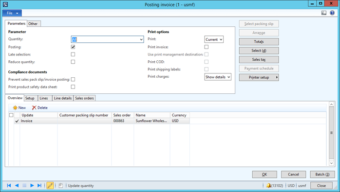 1. Go to Sales and marketing -> Common -> Sales orders. Create a new Sales order, select customer US-019 (Sunflower Wholesales) and click Ok