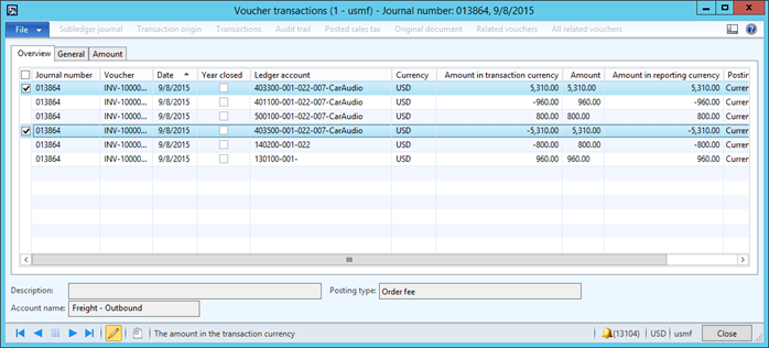 • freight charge is shown in invoice voucher transactions (one GL transaction for a positive amount, one for a negative amount).