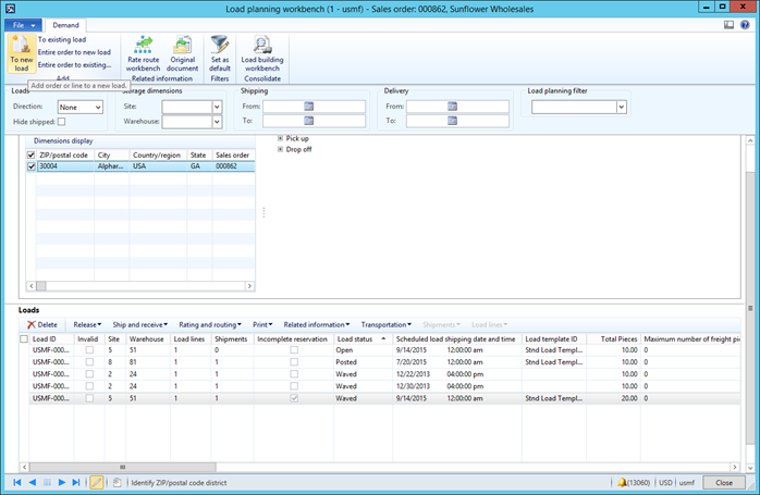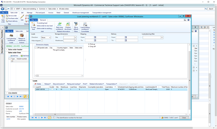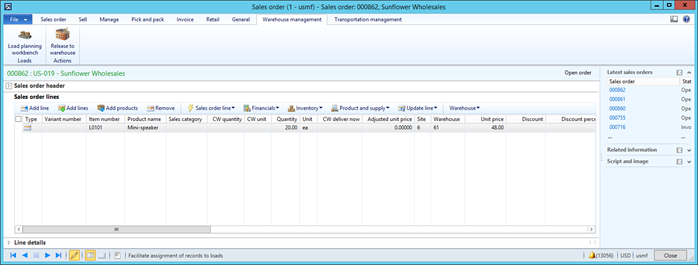 4. In the top ribbon, select the warehouse management tab -> Load planning workbench. Select the Sales order line and press Add to new load.