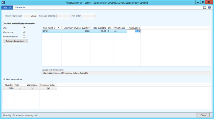 3. From Sales order form, press Inventory -> Reservation and press Reserve lot. Quantity is reserved.
