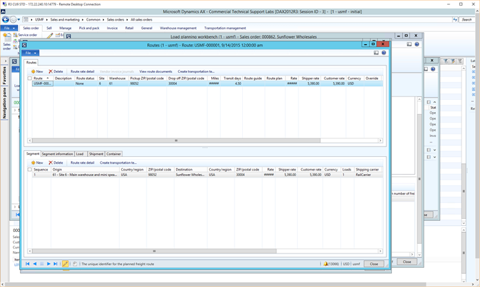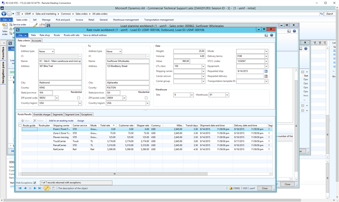 6. Select the load Id and press Rating and routing -> Rate route workbench; in the Rate route workbench form, press the Rate shop button to view all rates available for this customer.