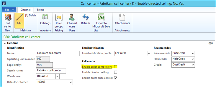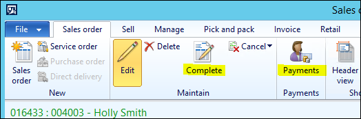 The credit card functionality in Call center can be used similar to that of AR. The only difference is the addition of the Complete and Payment buttons to submit the payment. When the “Enable order completion” option is marked in the Call center channel, these option will become available on the Sales Order.