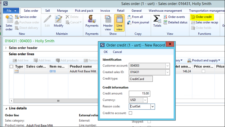 Call Center does add a feature called “Order credit” to the Sales order form. Using this button, you can perform standalone credits to the customer from the Invoiced order (it must have at least 1 invoiced line) without having to return an item or create a credit note. You would just simply enter the amount of the credit with a reason code and post it. The 2 biggest drawbacks to utilizing this workflow is that this credit will not be directly associated to the sales order, and that the posting will only affect the Customer Account offset by the Offset account listed for the Journal specified in the Call center parameters. It is strongly recommended to test this workflow to ensure it meets your posting needs prior to use.
