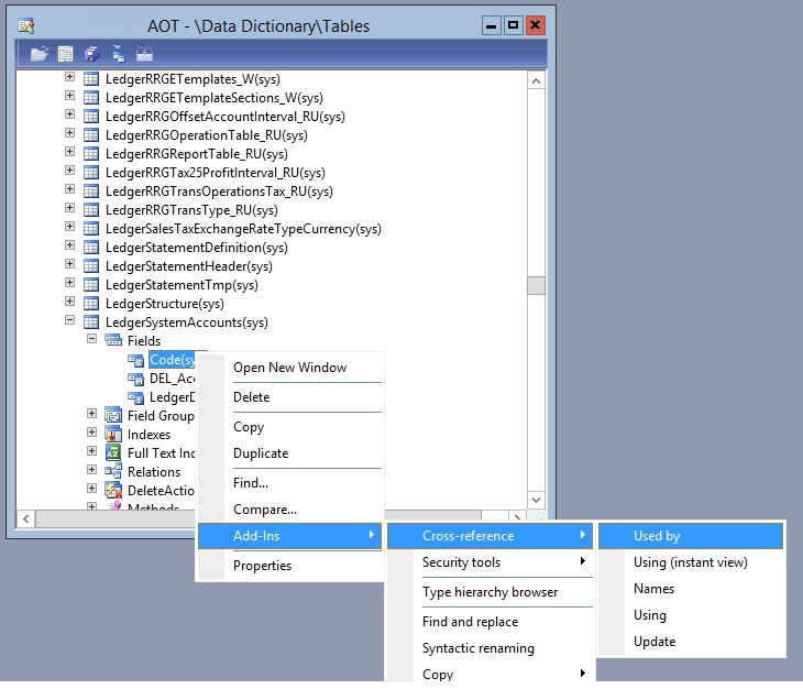 5. I go to the AOT, short cut from the application is pressing Ctrl + D and locate the ‘LedgerSystemAccounts’ table(DataDictionary\Tables) and go to the field ‘Code’