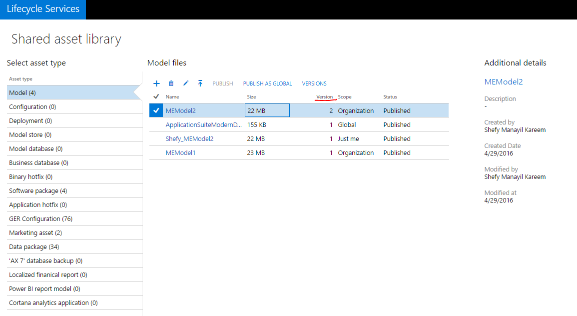 Note that the Version column shows the latest version number of the asset that is in the asset library.