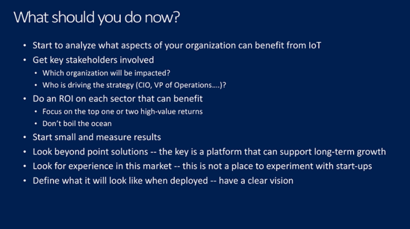 One of the easiest ways to truly move forward with IoT is simply by contacting us; we have experience in the market (second-to-last bullet) on solutions in this space. We can help you with ROI, measurement, and vision as well.
