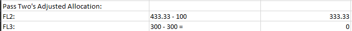 by the amount looking to allocate of 183.33. This leaves 100.00 to allocate to FL2. After Pass Two, it will have these amounts