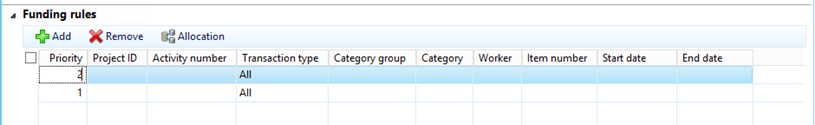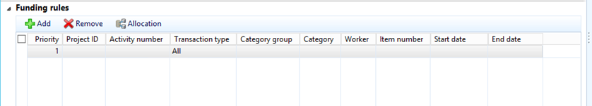 - Back in the Project Contracts form under Funding Rules fast tab, click Add.