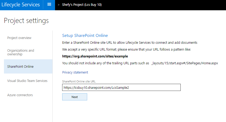 - On the Project settings page, click the SharePoint Online tab.