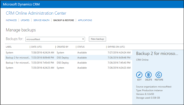 Backup and restore CRM online instance