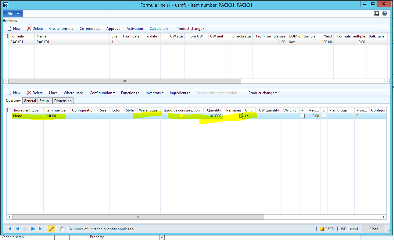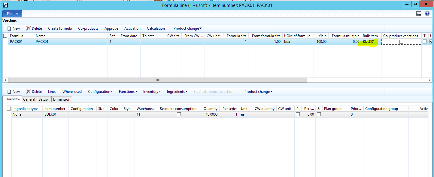 I’ve recently worked with customers whom are attempting to create Bulk item conversions into the Formula configuration for a Packed Item and have MRP have the capability to generate Planned Orders for both the Pack and the Bulk Item. As a result of this, I’ve documented the overall setup\configuration, as an example, in order to accomplish this scenario. Please take a look at the following example\scenario assumed from a Dynamics AX 2012 R3 CU11 environment: