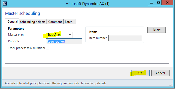 b. In the Master scheduling form, select ‘StaticPlan’ from the Master plan field, and then click OK.