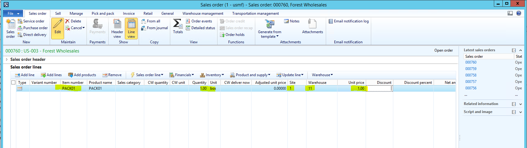7. Create a new Sales order for the PACK01 item by taking the following steps: