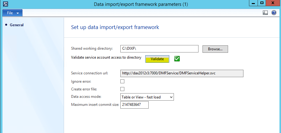 d. Back in the Data import/export framework parameters form, select the DIXF Folder in the Shared working directory field, and then click the Validate button.