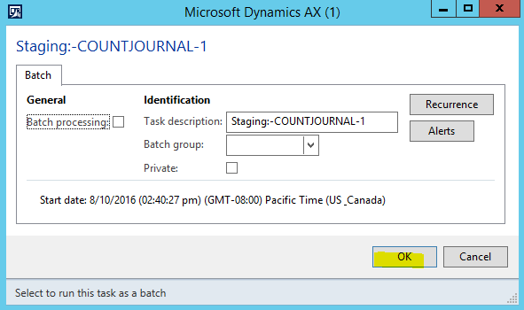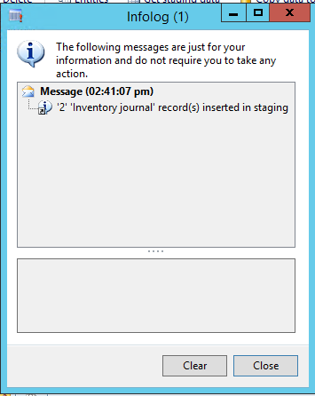 h. Close the InfoLog that opens stating “2 Inventory journal records inserted in staging.”