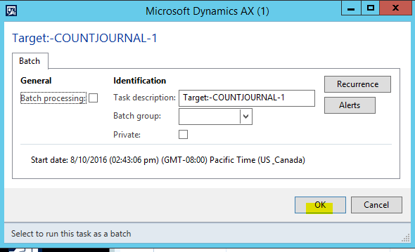 l. In the Target:COUNTJOURNAL pop-up form, click OK.