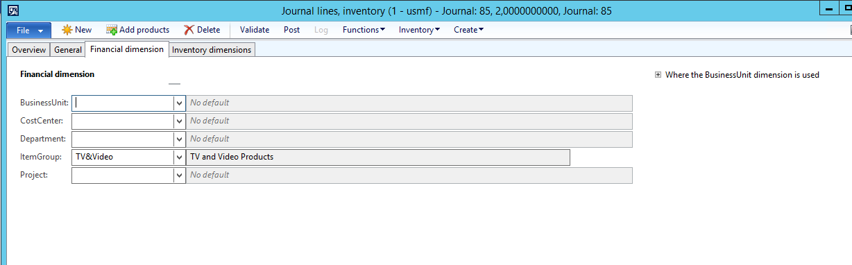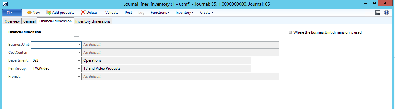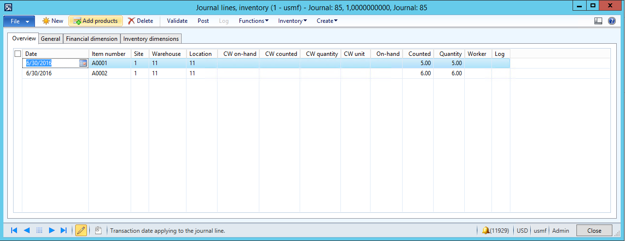 You can see that the Inventory counting journal was created in AX as Journal number 85, containing both lines from the Source file, and the Financial dimensions that were assigned to the Released product were included on the imported Counting journal lines.