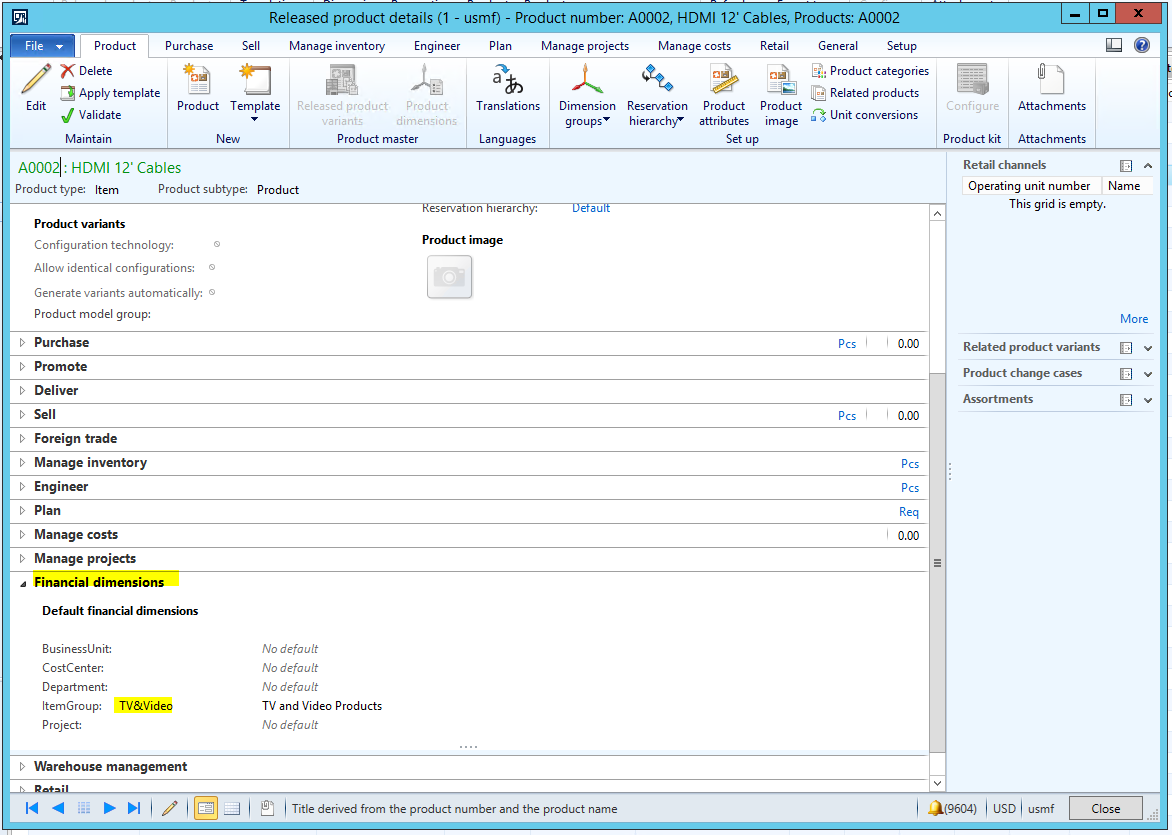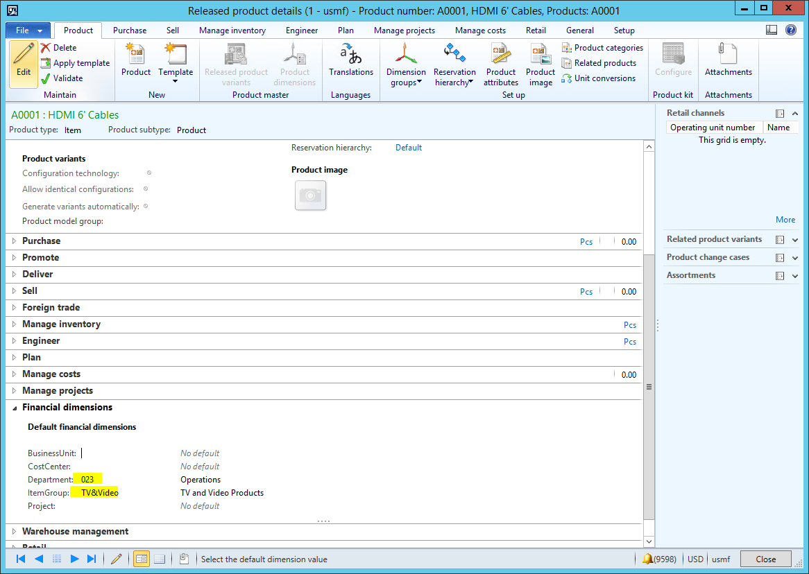 c. In the Released product details form, expand the Financial dimensions fast tab.