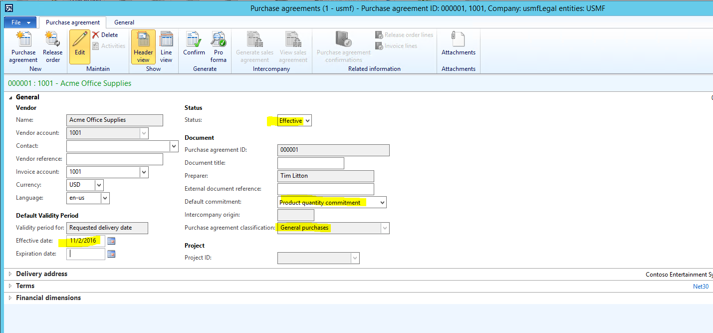 Purchase agreement ID = Select the purchase agreement you created prior.