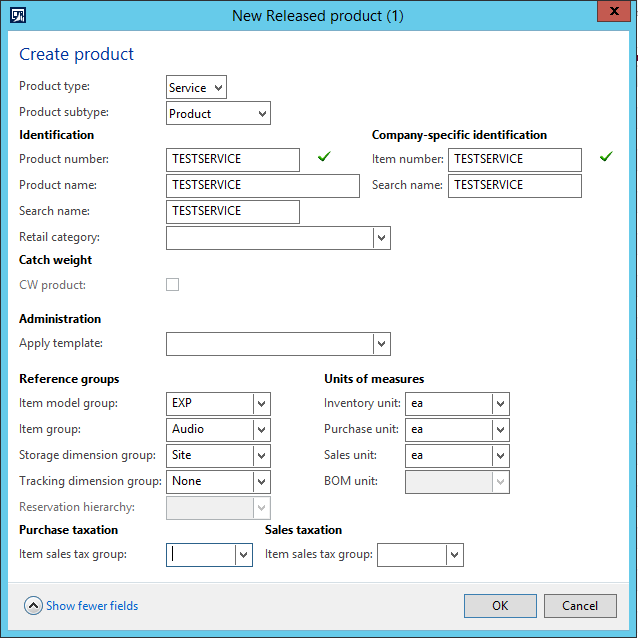 Product number, Product name, Search name, Item number, Search name = TESTSERVICE