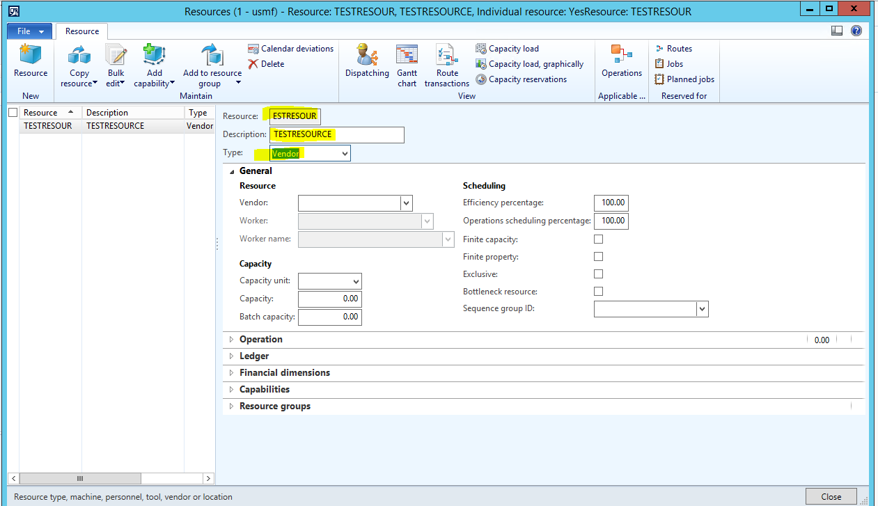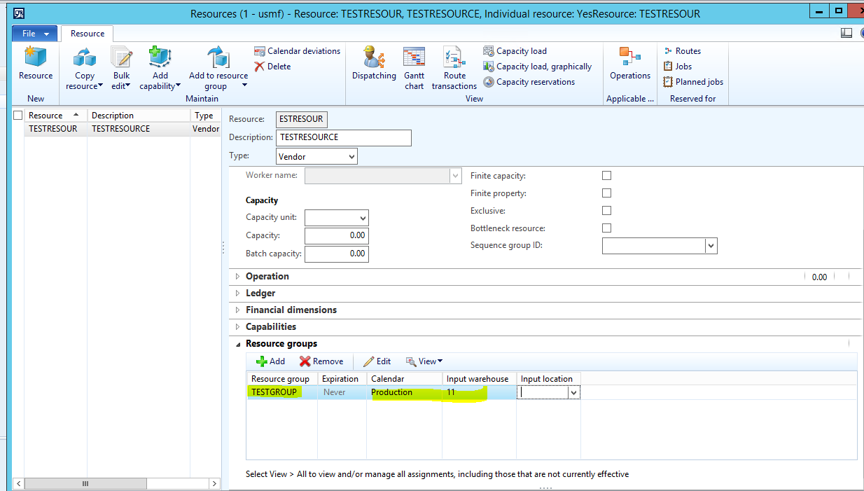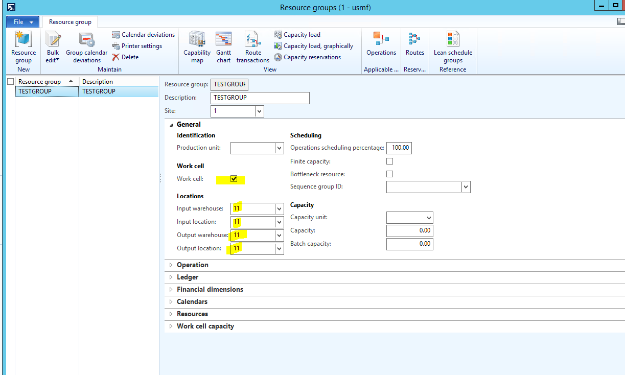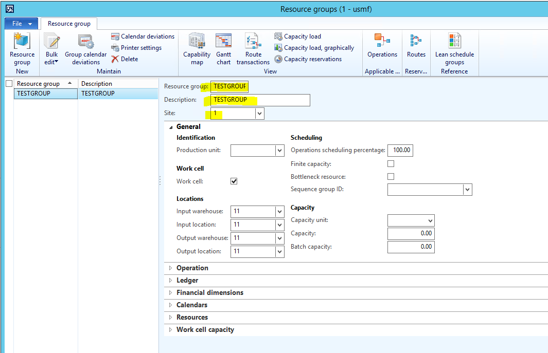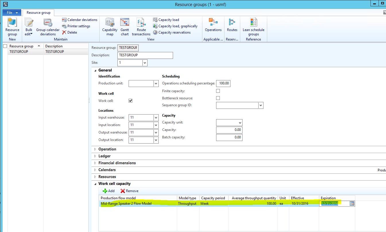 - A Resource group is created called TESTGROUP which is flagged as a Lean ‘Work cell’ and has a Production flow model configured on the Work cell capacity fast tab.