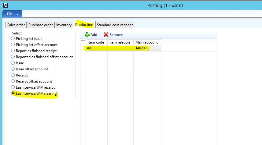 - Click the Lean service WIP clearing radio button, click the Add button, and enter the following line: