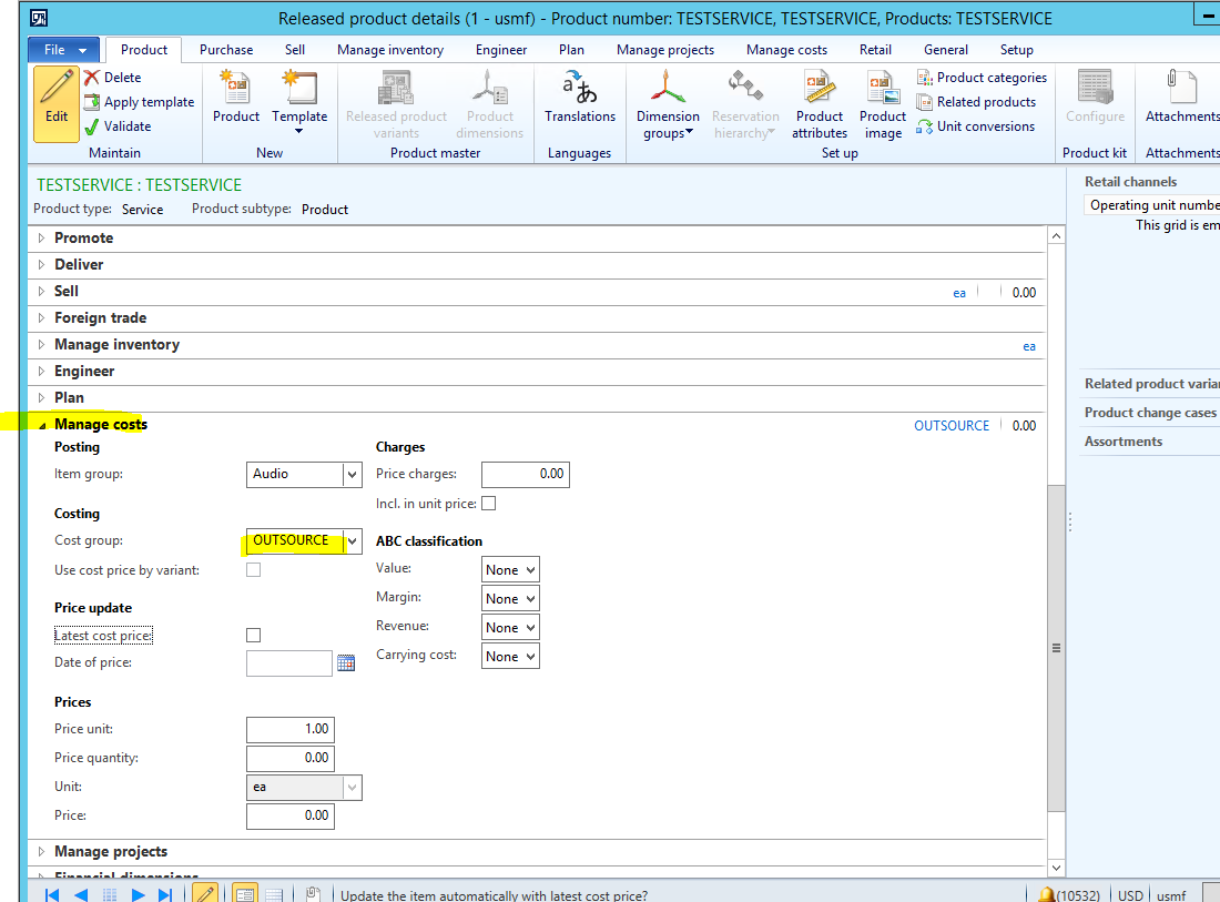 - A Service Item exists called TESTSERVICE which has the OUTSOURCE Cost Group assigned.